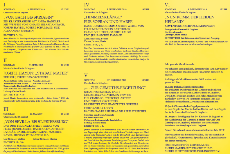 Eine Veranstaltung der Pfarrei Heiliger Ingobertus im Rahmen des Kulturrings der Stadt St. Ingbert in Kooperation mit dem Förderverein Kirchenmusik St. Hildegard e. V. und dem Förderverein für Kirchenmusik an der Martin-Luther-Kirche und an der Christuskirche e. V.